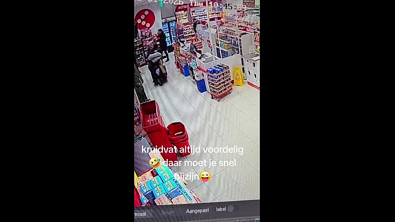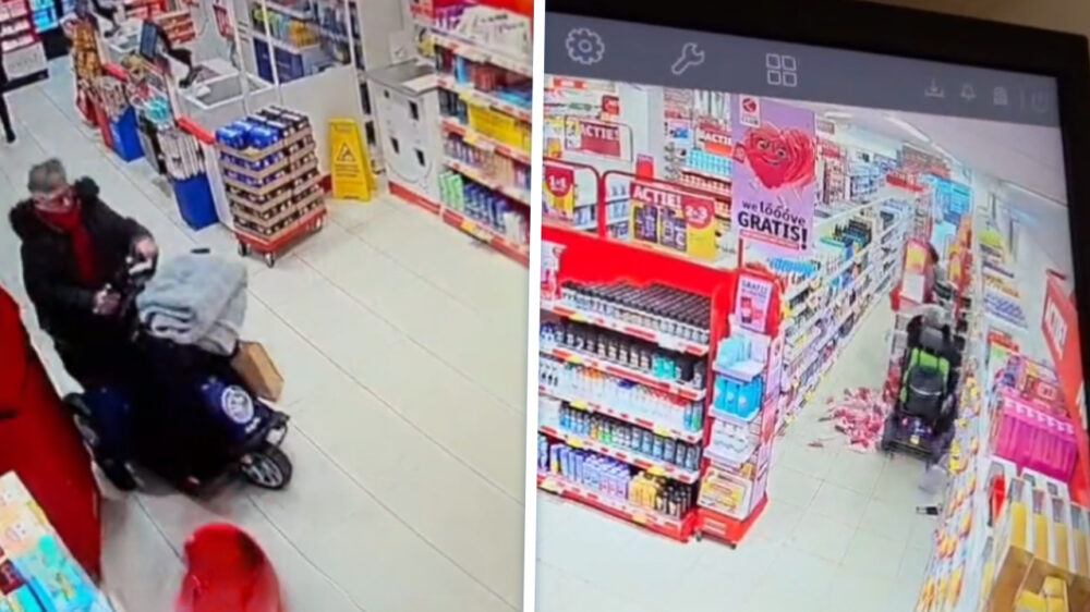 Scootmobiel draait door en gaat vol gas door de Kruidvat in Stadskanaal