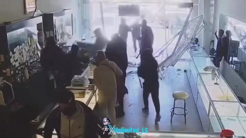 Beelden laten zien hoe een auto dwars door de pui van de juwelierszaak rijdt. Direct daarna rennen meer dan tien overvallers naar binnen, slaan vitrines kapot en graaien sieraden mee. Een van hen duwt de eigenaar tegen de grond. Een goede vriendin van de familie vertelt dat ze kort daarna bij de winkel aankwam. Zij zegt: "He is OK; business is not OK. Everyone knows that situation right now. Every business is in danger."