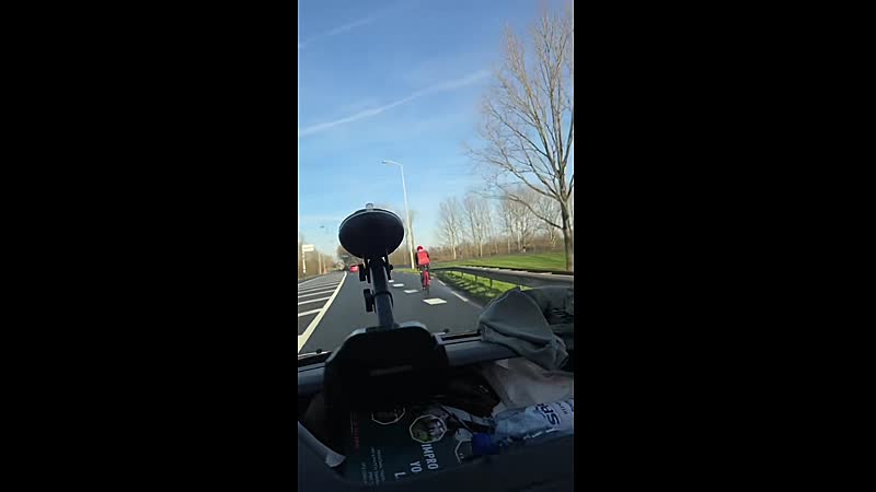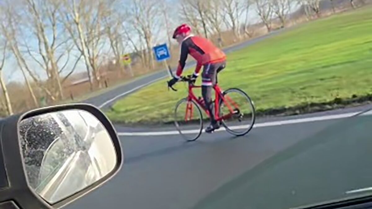 Een wielrenner op leeftijd dacht blijkbaar dat de autoweg een prima route naar huis was. Terwijl het verkeer langs hem raasde alsof hij in een Tour-etappe zat, bleef hij rustig doortrappen. Gelukkig was er een automobilist die hem kon terugfluiten.
