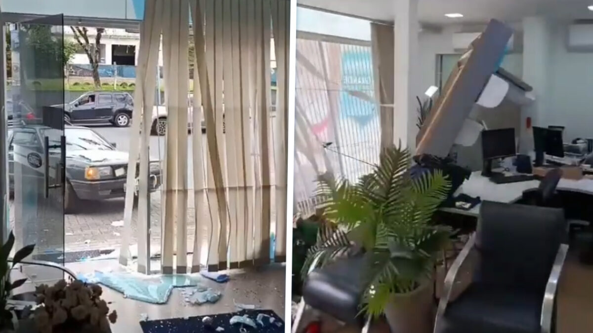 De schade werd uiteraard vastgelegd door omstanders en medewerkers, die precies op tijd hun telefoon omhoog hadden. Op de beelden hoor je vooral paniek, geschreeuw en een hoop “dit meen je toch niet?” terwijl glas, gordijnen en kantoorinrichting het ontgelden. Een deel van de voorgevel ligt aan diggelen en binnen ziet het eruit alsof er net een matige orkaan doorheen is gewandeld.