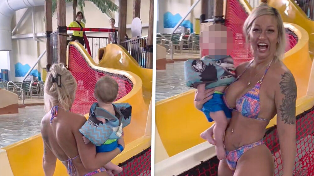 In het familiewaterpark draait het meestal om gillende kinderen en uitgeputte ouders, maar één moeder weet dat iedere keer weer helemaal op z'n kop te zetten.