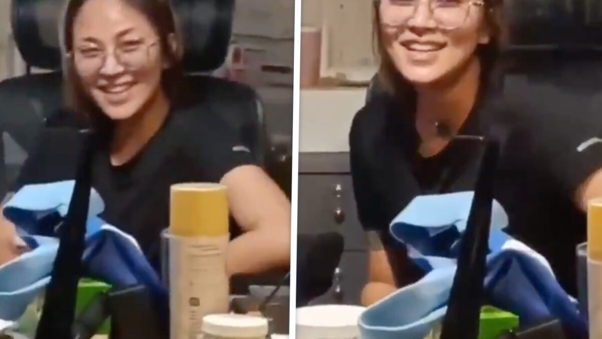 Vrouw betrapt terwijl ze onder haar bureau aan het frunniken is