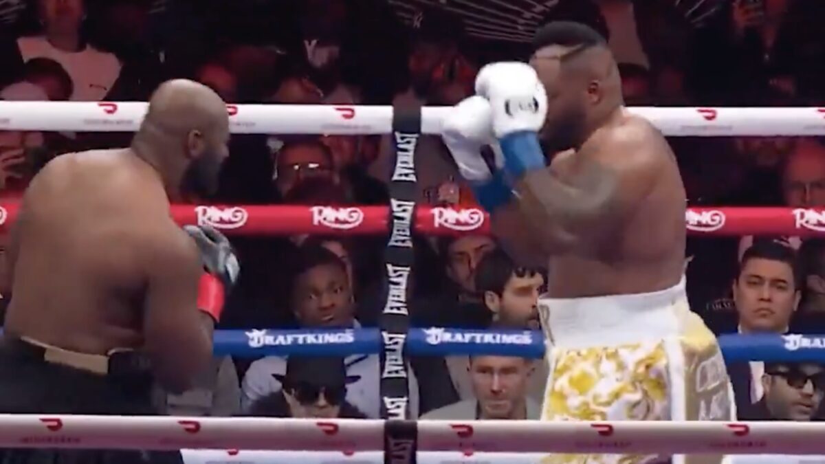 Terwijl de combinaties blijven komen, schuift de toupet richting achterhoofd tot het alleen nog maar net blijft hangen. De twee vochten op de undercard van het gevecht tussen Teofimo Lopez en Shakur Stevenson om de WBO super-lichtgewichttitel, maar het haar-incident van Jarrell Miller kreeg de meeste aandacht.