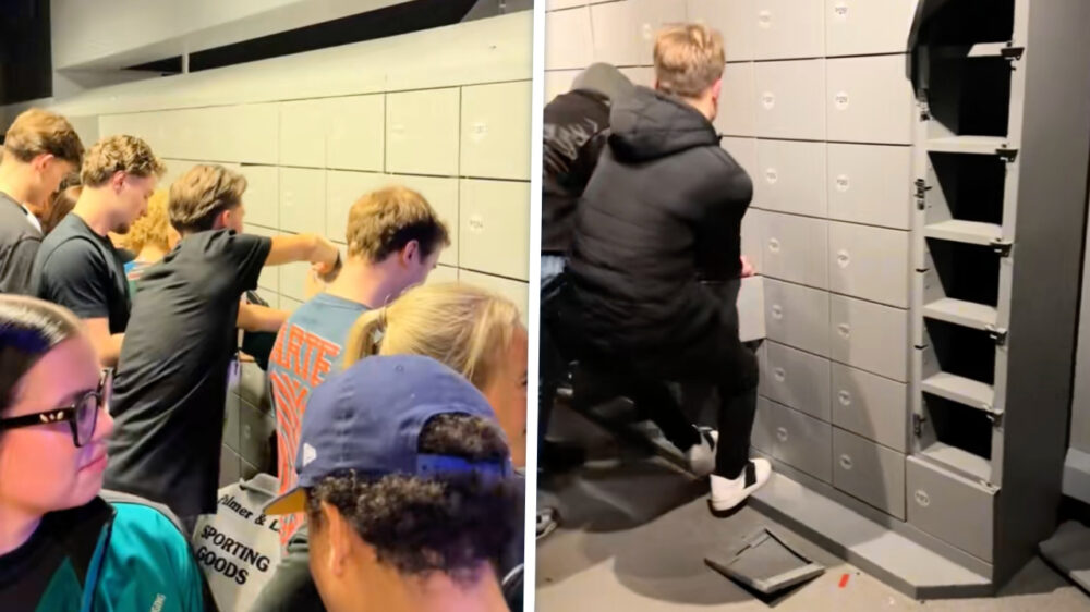 Naar verluidt worden dit soort kluisjes met je telefoon opengemaakt, maar aangezien het bereik en de wifi door de drukte totaal niet werkte, gingen die krengen natuurlijk ook niet open. Dus wat doen je dan als je geen zin hebt om zonder jas en sleutels naar huis te moeten? Juist, je breekt ze gewoon open.