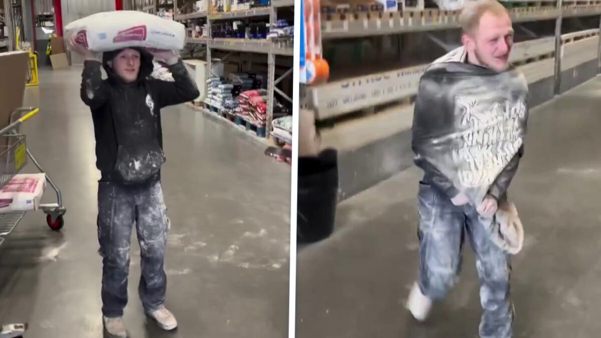 De oudste internetgrap leeft weer vrolijk verder in de bouwmarkt, waar een nietsvermoedende nieuwkomer even wordt ingewijd met een volle zak poeder op z’n harses. De rookie krijgt een zak mortel over zich heen en het hele gangpad ziet eruit alsof er een meelbom is afgegaan.