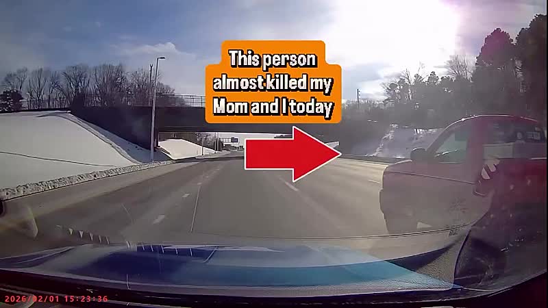 Op een Amerikaanse snelweg ging het weer eens mis toen een rode pickup met zijn verkeerde been uit bed was gestapt. De malloot snijdt een auto met moeder en zoon af en ramt ze zo de vangrail in.