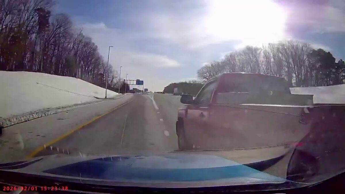 Op een Amerikaanse snelweg ging het weer eens mis toen een rode pickup met zijn verkeerde been uit bed was gestapt. De malloot snijdt een auto met moeder en zoon af en ramt ze zo de vangrail in.
