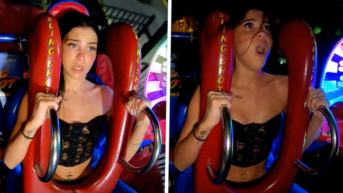Deze slingshot-prinses dacht blijkbaar dat ze in een hotelkamer zat in plaats van aan een boulevard. Zodra haar stoeltje omhoog schoot, kwam ze zelf ook tot een hoogtepunt en de rest van het publiek mocht ongevraagd meegenieten.
