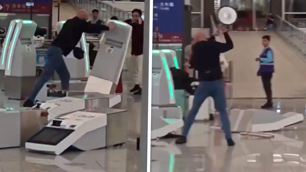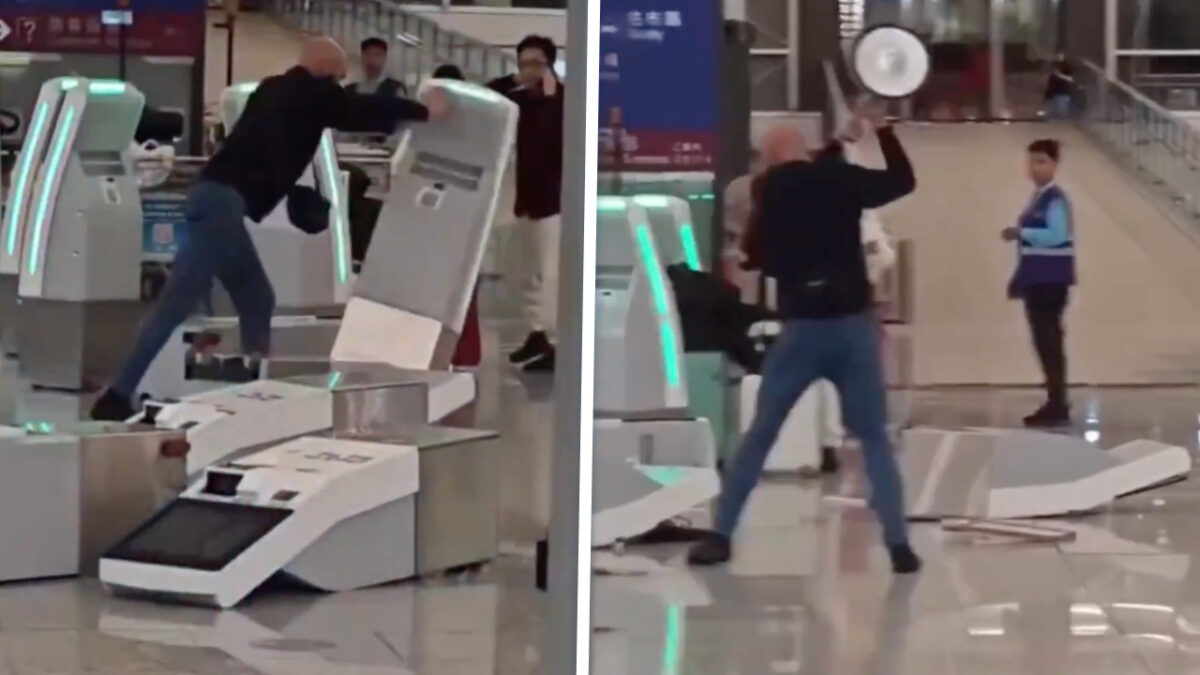 Geflipte Brit opgepakt die incheckzuilen op vliegveld Hongkong sloopt Gekkies