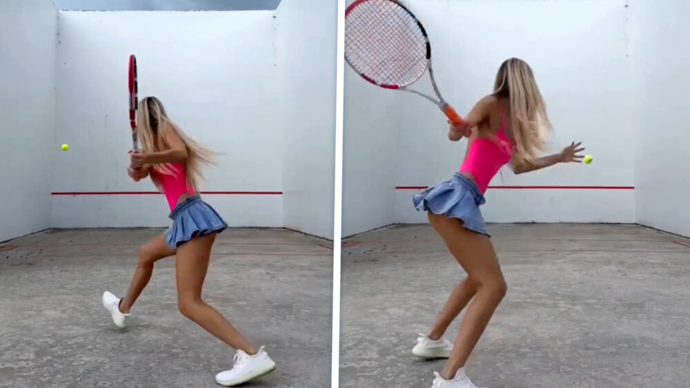 Terwijl de meeste tennissers zich verschuilen in de sportschool, zoekt Angelina Dimova de buitenlucht op voor een sessie die zowel sportief als visueel indruk maakt. In deze video zien we hoe de influencer en tennisster een uiterst fitte indruk maakt bij het oefenmuurtje. Prima techniek ook, al zeg ik zelf.