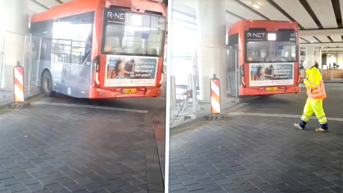 Ondanks het toeziend oog van een legertje verkeersregelaars, besloot de chauffeur de bouwconstructie van het nieuwe busstation even persoonlijk te inspecteren. Het resultaat is een bus die een hekje kopt dankzij een chauffeur die misschien iets te hard naar zijn podcast zat te luisteren.
