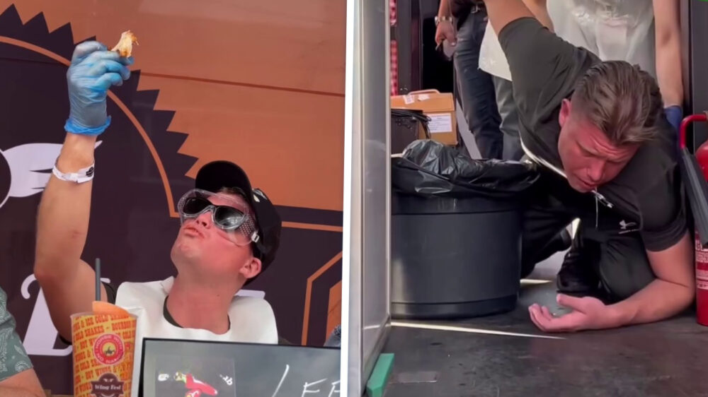Stoertje dacht even de held uit te hangen bij de heetste kippenvleugelswedstrijd ter wereld, maar na een aantal vleugels veranderde de bravoure in blinde paniek. Binnen no-time spoot hij z’n maaginhoud eruit en werd huilend van het podium geveegd.