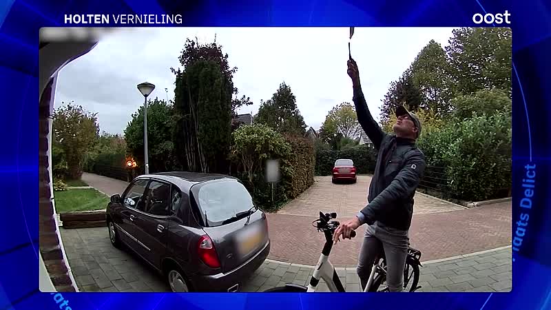 Een man op een witte Koga-fiets heeft het gemunt op een woning in Holten. Eerst probeert hij de vlag die bij het huis hangt in brand te steken. Dat mislukt, waarna hij de vlag meeneemt. Daarmee is het niet klaar, want een paar dagen later komt hij terug bij hetzelfde adres.