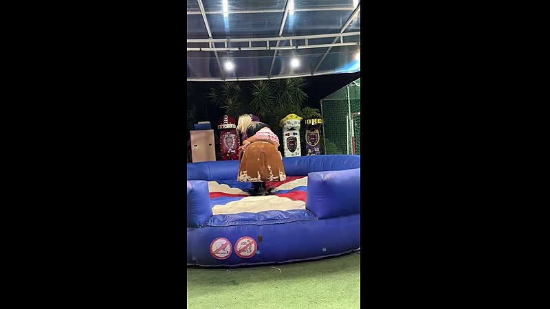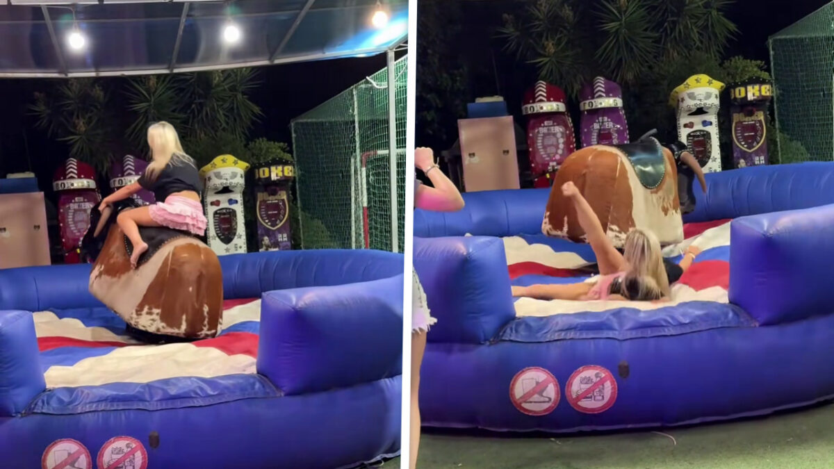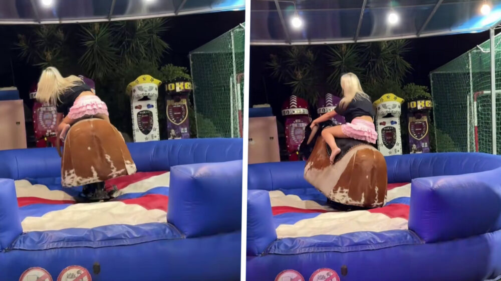 Ritje op mechanische stier verandert in gratis show dankzij ultrakort rokje
