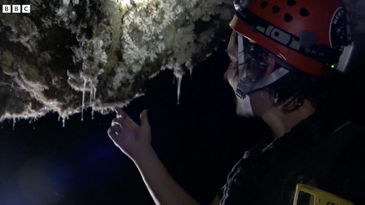 Geowetenschapper Daniel S. Jones legde uit dat deze biofilms een pH van nul of één hebben, wat betekent dat ze extreem zuur zijn. Brian Cox raakte de biofilm met zijn blote handen aan en noemde de Snottites “vreemde organismen” die zo zuur zijn als batterijenzuur.
