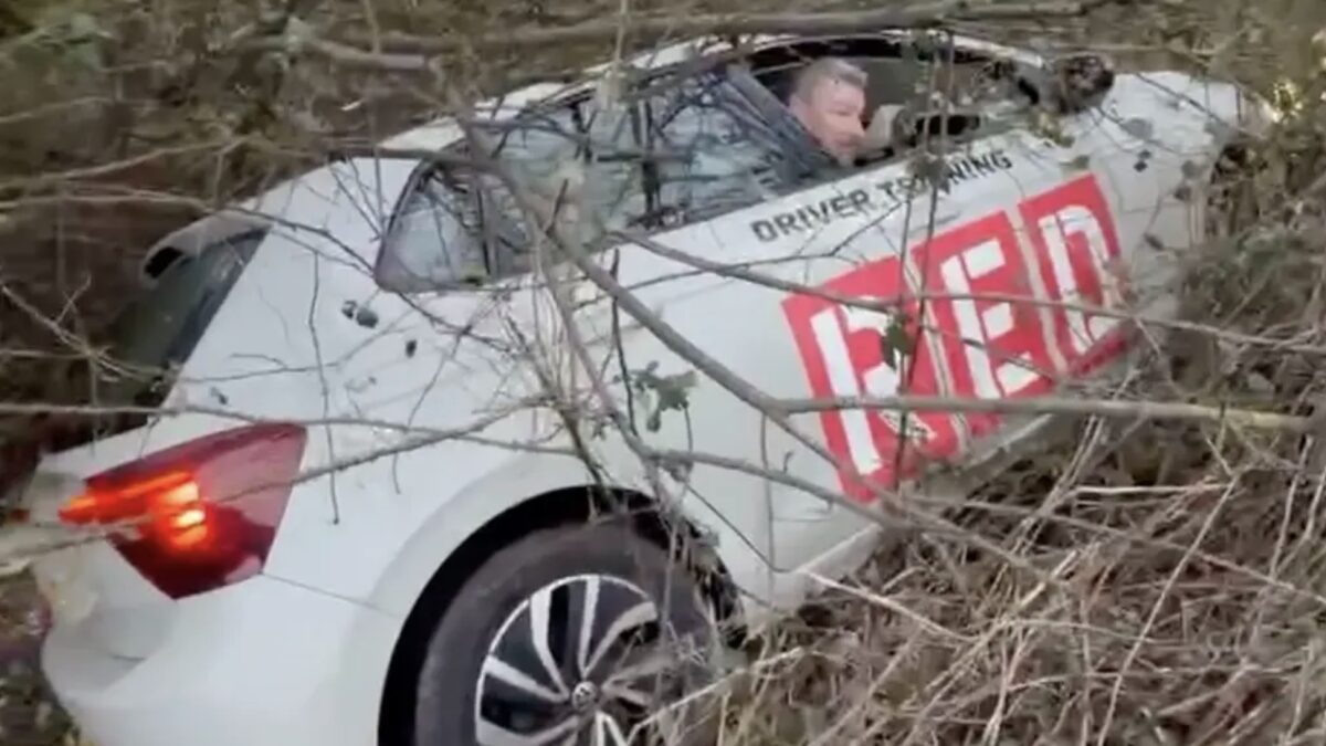 In Wales is een rijinstructeur van Red Driving School in een greppel geëindigd terwijl hij onderweg was naar zijn eerste leerling van de dag. De 54-jarige Timothy Howells crashte zijn lesauto, een met rijschoollogo uitgevoerde VW Polo, rond 07:38 op vrijdag 20 februari op de A484 tussen Pembrey en Kidwelly in West-Wales.