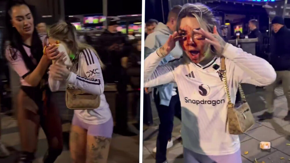 Blondje strompelt na een avondje stappen met een frietje in de hand en genoeg ketchup om een heel zorghuis blij te maken. Net als ze d’r eerste hap wil nemen, komt er uit het niets een andere troela in beeld die het frietje inclusief ketchup rechtstreeks in het blondje haar smoel duwt.