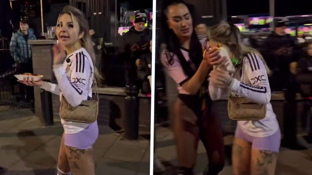 Blondje strompelt na een avondje stappen met een frietje in de hand en genoeg ketchup om een heel zorghuis blij te maken. Net als ze d’r eerste hap wil nemen, komt er uit het niets een andere troela in beeld die het frietje inclusief ketchup rechtstreeks in het blondje haar smoel duwt.