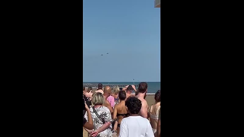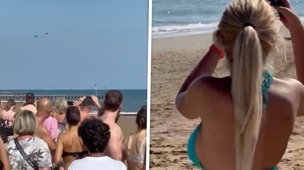 Terwijl de rest van het gepeupel met een stijve nek naar de blauwe lucht staat te turen voor een paar voorbijrazende straaljagers, heeft onze cameraman van dienst zijn prioriteiten pas écht op orde. Want laten we eerlijk zijn: die F-16's zijn leuk, maar het uitzicht op de eerste rang aan de waterkant is pas écht om over naar huis te schrijven.