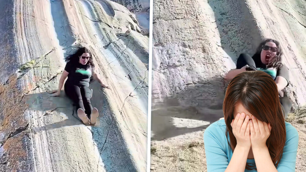 Eén vrouw besluit het gewoon te proberen en zet de afdaling in. In het begin lijkt het nog een prima idee. Tot het moment dat de landing minder charmant blijkt dan gedacht. Die gebroken enkel zagen wij wel aankomen, maar zij waarschijnlijk niet.