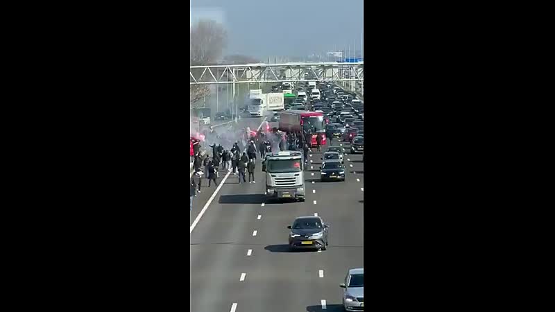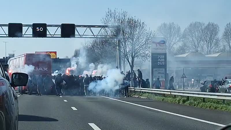 Volgens de Amsterdamse politie stonden er tussen de 100 en 200 mensen op de A4. Op beelden die op social media rondgaan is te zien dat de spelersbus stil komt te staan en daarna in een boog om de groep onruststokers heen rijdt. De groep loopt met fakkels en Ajax-vlaggen over de snelweg en scandeert leuzen. Op filmpjes zijn ook knallen te horen.