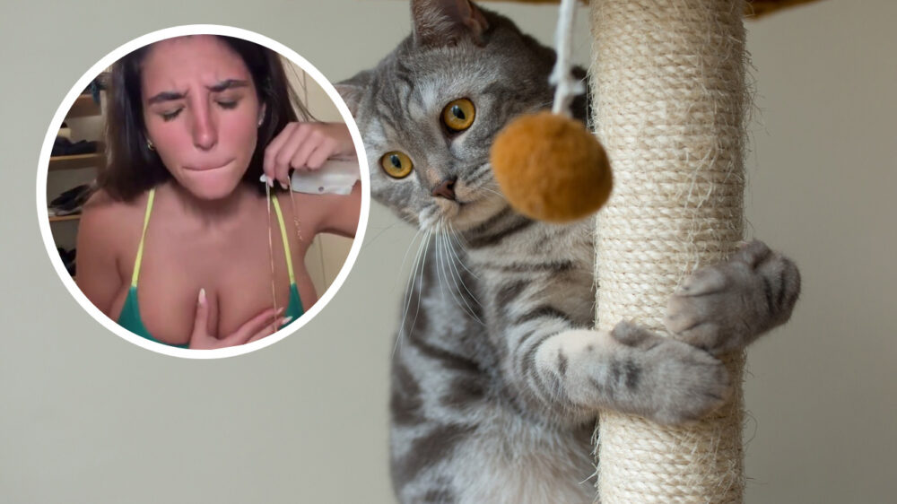 De talentvolle Ika D’Auria probeert even subtiel haar sieraden te flexen, maar haar kat heeft duidelijk andere plannen. Die ziet geen influencer, maar een bewegende krabpaal met bonuspunten.