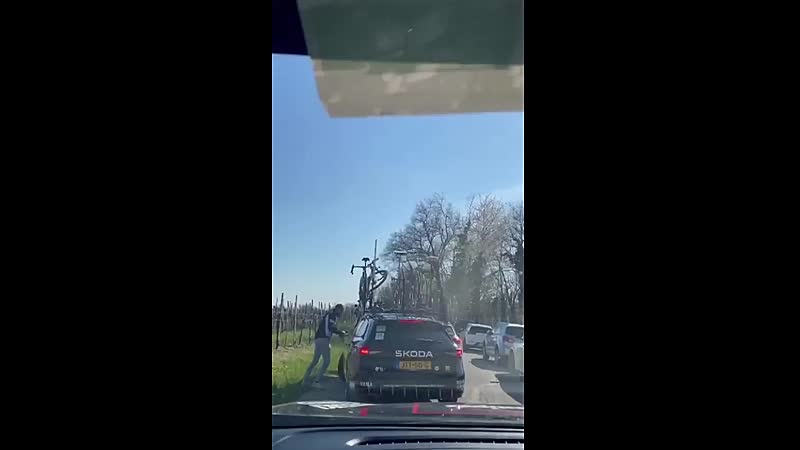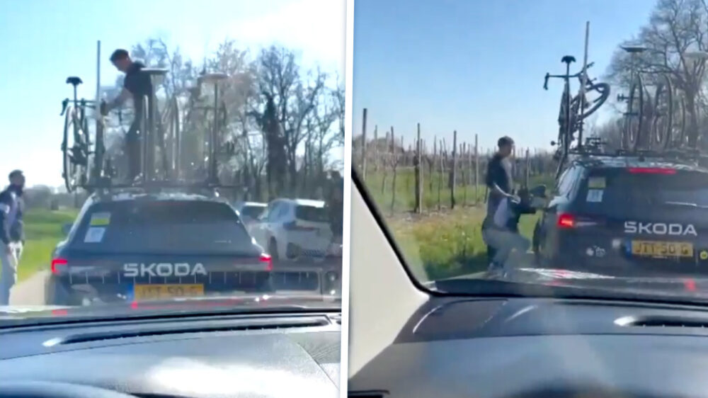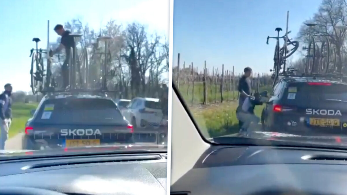 Dronken man probeert fiets te jatten van Visma-auto tijdens Coppi e Bartali