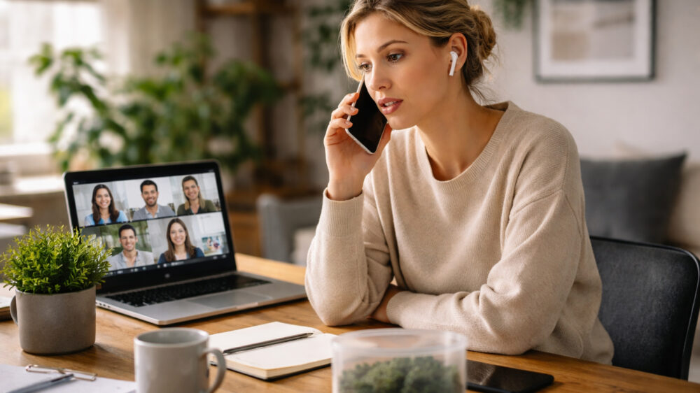 Terwijl de rest van het team braaf luisterde naar de monoloog van de manager, besloot zij de logistiek voor haar eigen 'vrijmibo' alvast te regelen. Kleine tip: vergeet vooral niet de 'mute-knop' in te drukken als je de lokale apotheker belt voor wat versnaperingen.