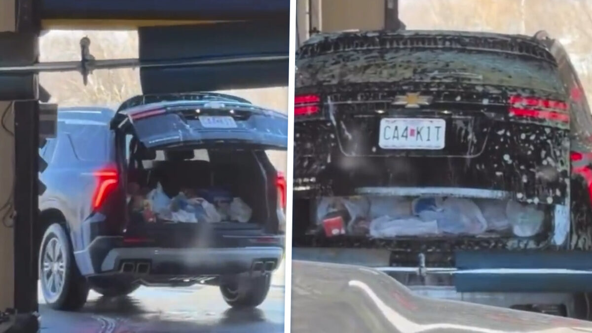 SUV rijdt wasstraat in met kofferbak open en ontdekt dat water nat is