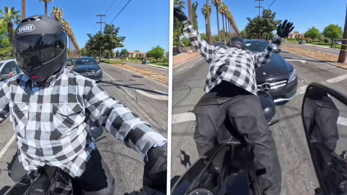 Motorrijder komt niet weg bij groen en wordt keihard geramd door Mercedes