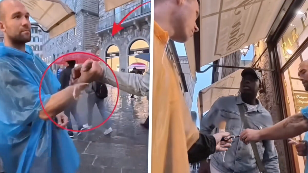 YouTuber Kurt Caz en z'n maat waren niet gediend van deze slappe trucjes. Terwijl hij rustig door de regen slenterde, probeerde een lokale 'ondernemer' hem een armbandje aan te smeren. "It's free, a gift!" riep de verkoper nog, maar zodra Kurt de gift accepteerde, sloeg de sfeer om en moest er opeens keiharde euro’s op tafel komen. De verkoper bleef maar pushen, bleef maar zeiken en dacht waarschijnlijk een makkelijke toerist te hebben gevonden. Foutje, bedankt. Kurt z'n bodyguard was er namelijk ook nog en die besloot de discussie op een vrij... directe manier te beëindigen.