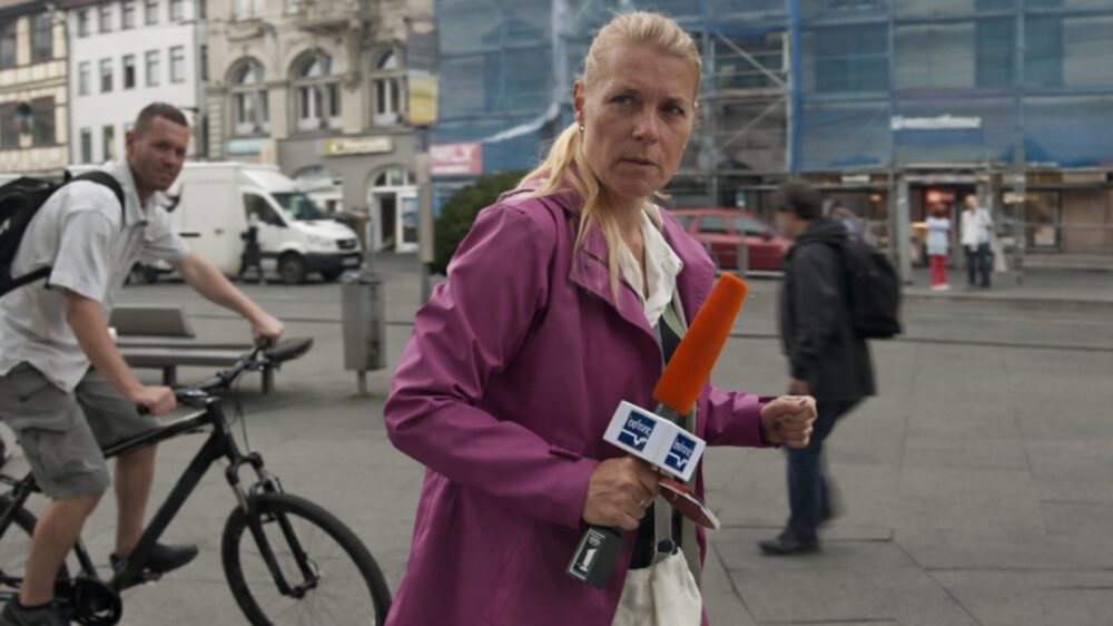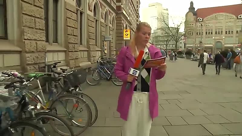 Een blije pedaalridder denkt leuk even de clown uit te hangen nonchalant door over een voetgangerszone te trappen, als hij ziet dat  er een verslaggeefster staat te praten. Maar daar heeft een andere Duitser dus precies nul geduld voor.