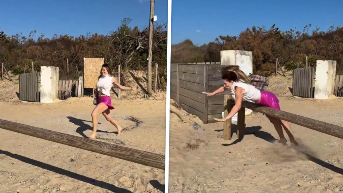 Ze verandert haar elegante sprong in een soort onbedoelde koprol, een beetje zoals je moeder die na vijf glazen rosé binnenkomt vallen. Technisch gezien kwam ze er wel overheen, maar niet helemaal zoals gepland.