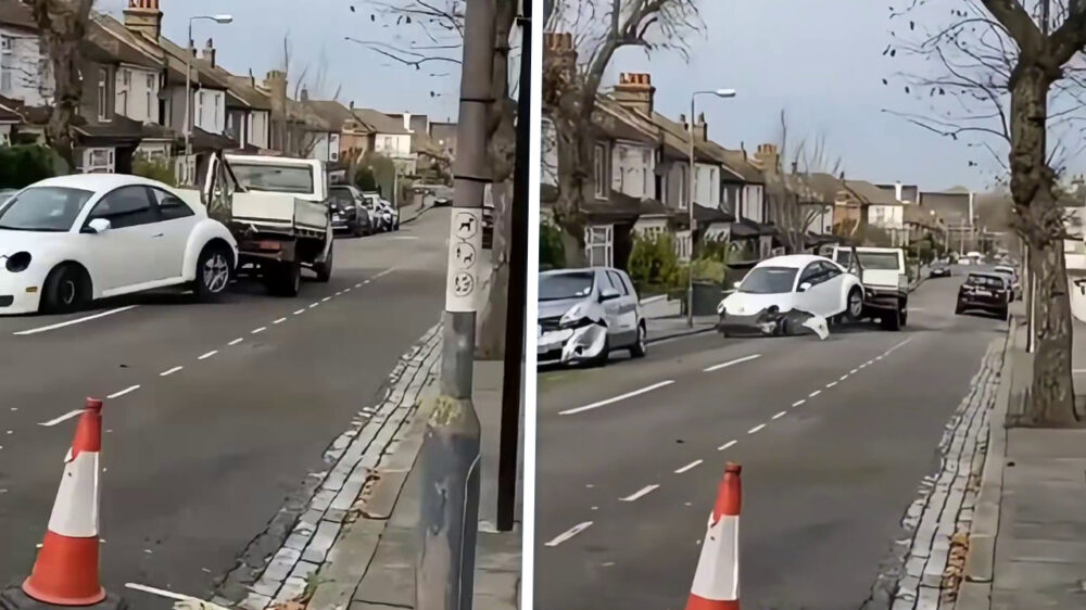Takelterrorist veroorzaakt chaos met bungelende Beetle achter sleepwagen