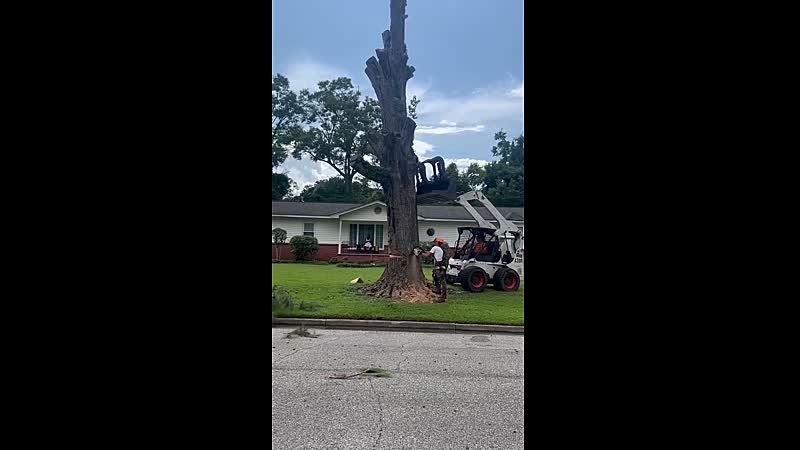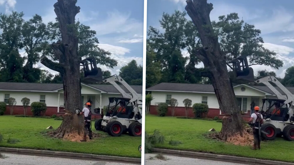 Sommige klussen vragen geduld. Dit is er zo eentje. Grote boom, dikke stam, en hopen dat het ding niet op het huis van de buren eindigt. En een vakman met een kettingzaag die duidelijk per uur betaald krijgt en daar maximaal van wil genieten. Bedankt voor je inzet hè!
