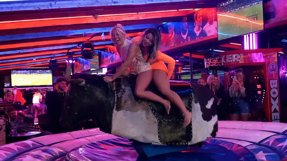 Twee vriendinnen denken even een 'onschuldig' rondje te maken op een mechanische stier, alleen loopt het deze keer nét iets anders aangezien het rokje van de Koningsdagvierster z’n eigen plan trekt.