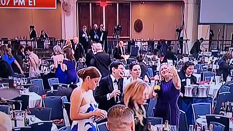 Schoten buiten, maar binnen lijkt het vooral happy hour. Tijdens de evacuatie van het chique White House Correspondents’ Dinner in Washington D.C. grijpen gasten hun kans en stoppen zonder gêne flessen wijn en champagne in hun jas. Eén dame in een zwarte bontjas steelt daarbij moeiteloos de show door doodleuk twee flessen mee te graaien terwijl de boel wordt ontruimd.