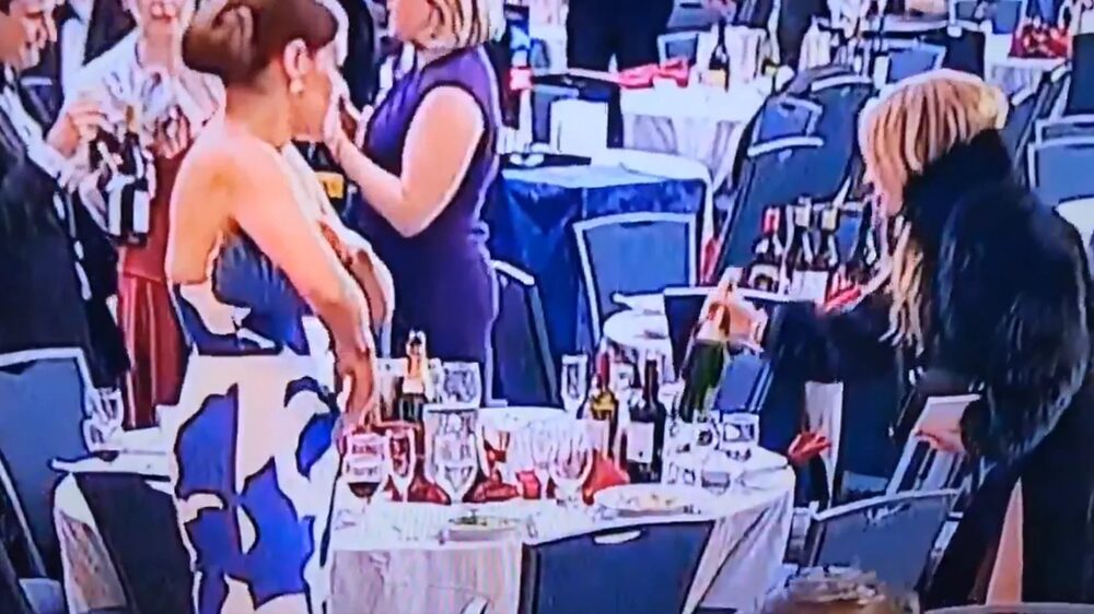Op beelden is te zien hoe groepen aanwezigen, van pers tot influencers, snel nog even de tafels leegtrekken. Wijn, champagne, alles gaat mee. De vrouw in bontjas pakt zonder haast twee flessen en loopt rustig door, alsof ze nog even boodschappen doet. Anderen maken er zelfs selfies bij, terwijl personeel probeert de zaal leeg te krijgen.
