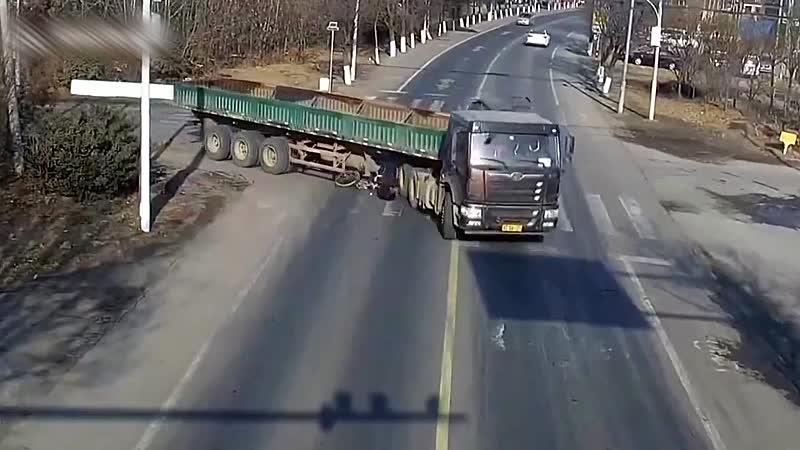 Chinese fietser mag van geluk spreken als hij onder een vrachtwagen belandt