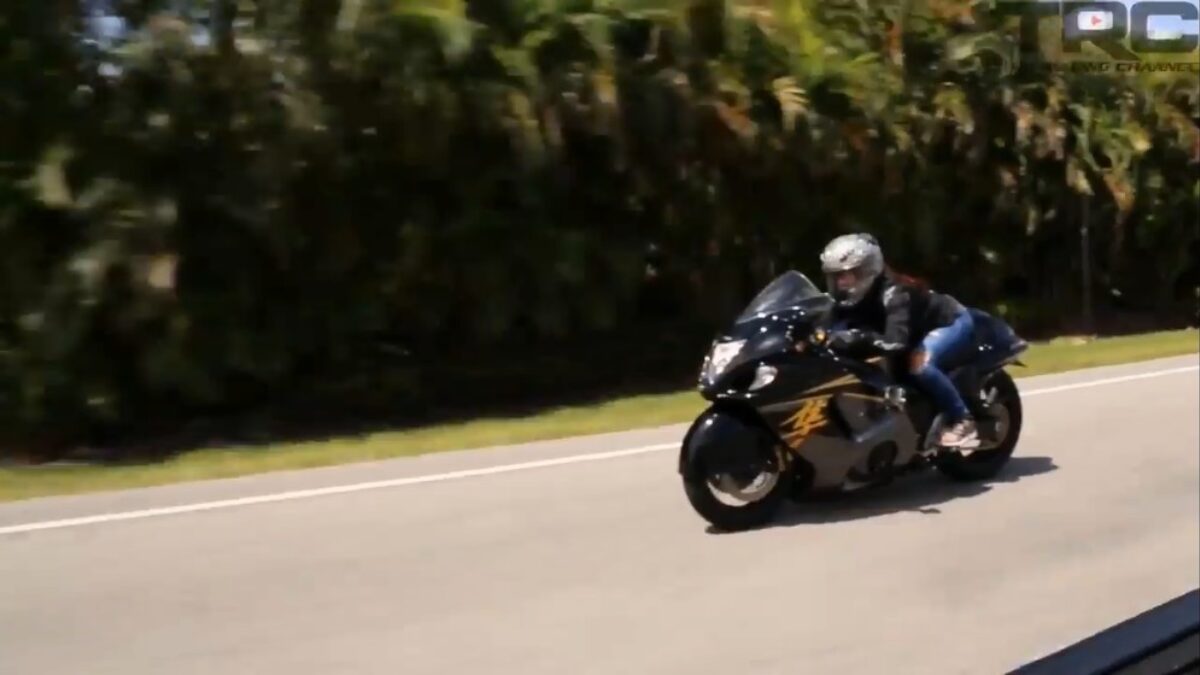 Vrouwelijke motorrijder op Hayabusa zet gastjes in Dodge Hellcat voor schut