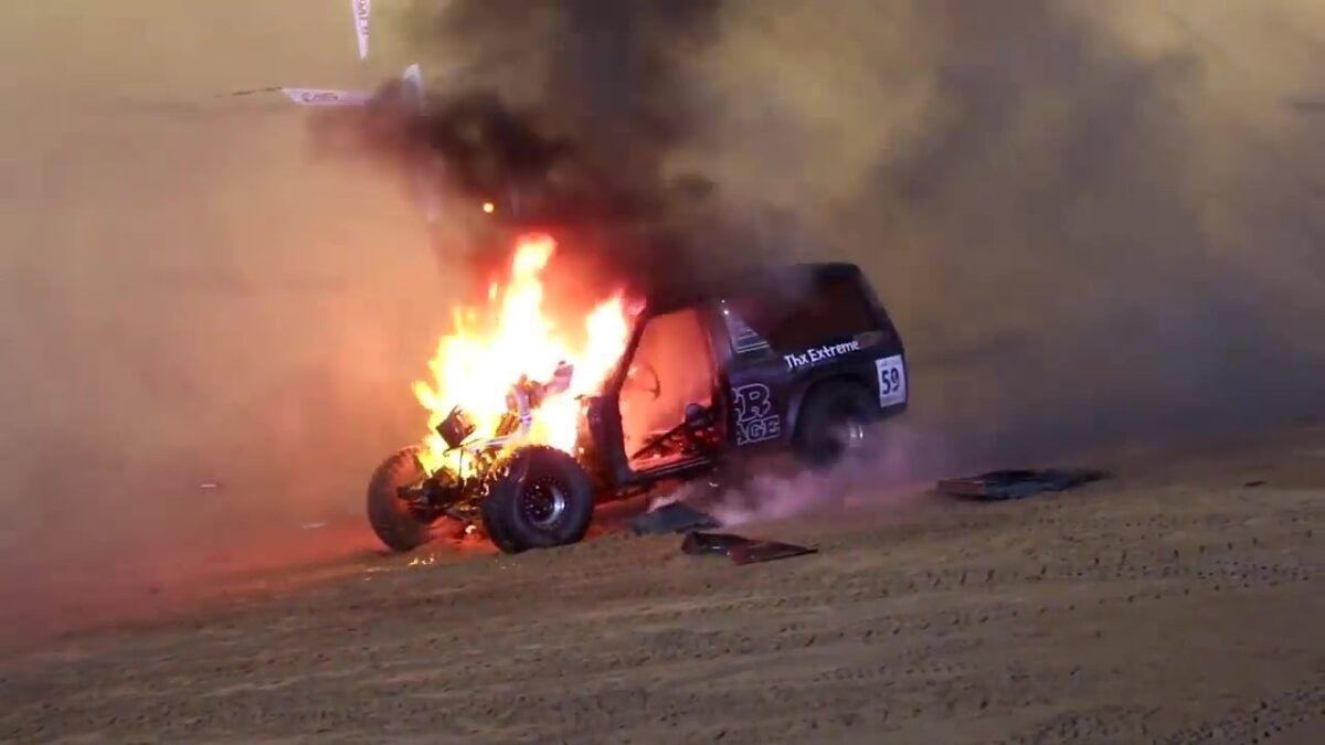Exploderende motor zet complete auto in lichterlaaie tijdens hillclimb Bizar