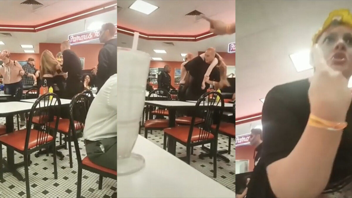 Kerel draagt zijn dronken vriendin als een holbewoner het fastfoodrestaurant uit