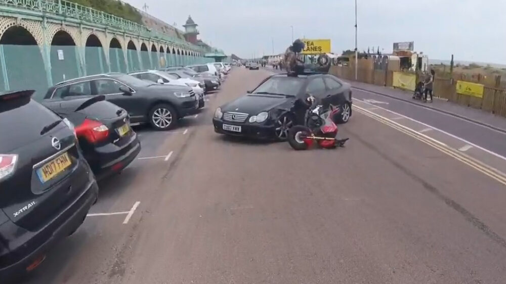 Motorrijder klapt vol op afslaande Mercedes en landt netjes bovenop het dak