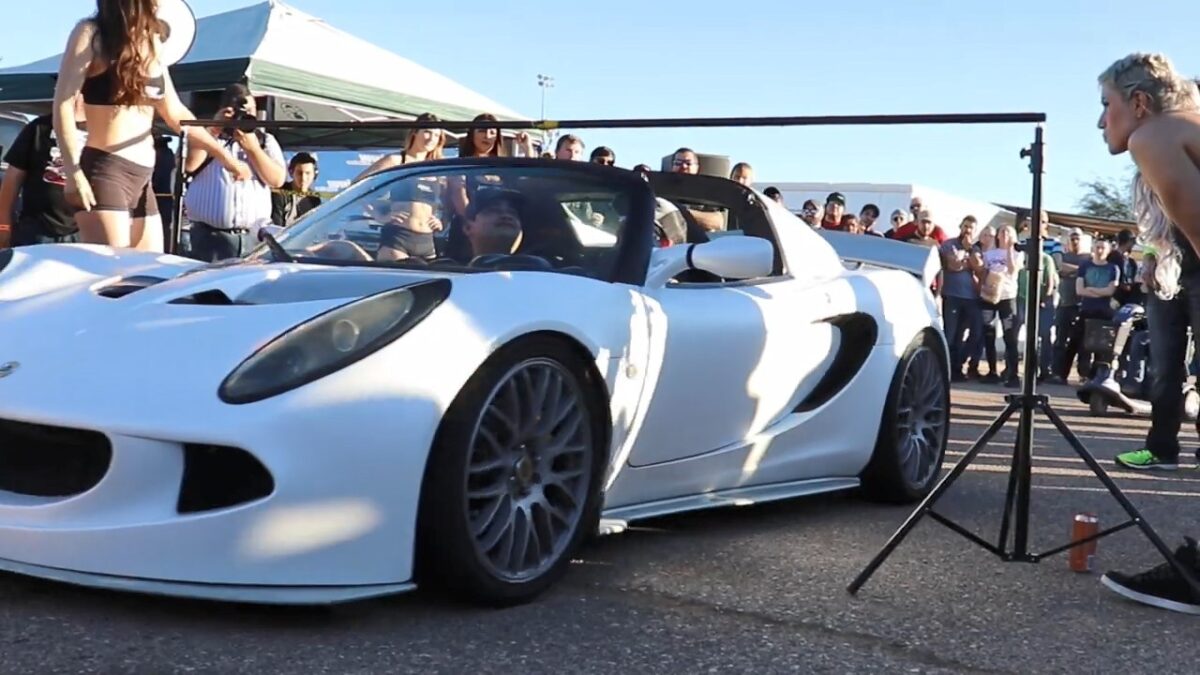 Gebrekkige Gerrie parkeert haar scootmobiel achterop een dikke Lotus tijdens het limbodansen