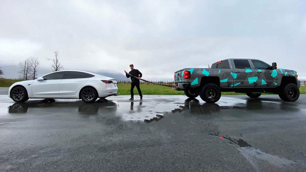 Een "Tug of War" tussen een Tesla Model 3 en een Chevrolet Silverado Duramax