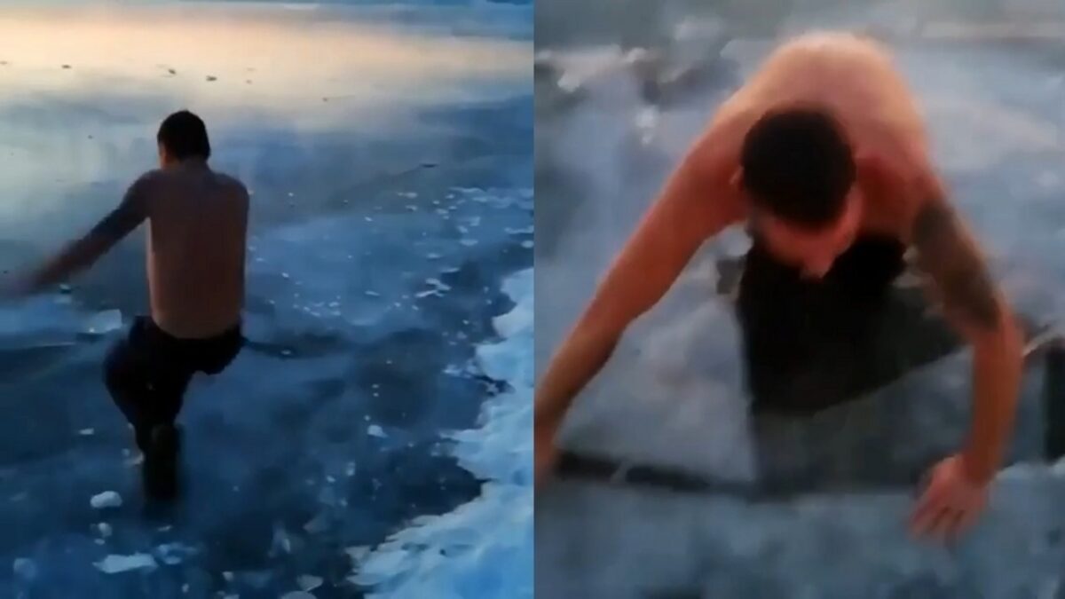 Russische nieuwjaarsduik verloopt niet helemaal vlekkeloos Fails