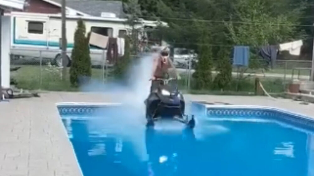 Mocht je eerdaags nog eens de neiging hebben om een zwembad over te steken op een sneeuwscooter: doe maar niet. Deze faalhaas laat je even zien waarom niet.