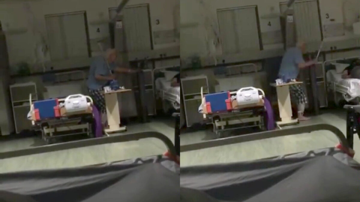 Zo te horen ligt dit ziekenhuis in Schotland, en zo te zien had opa schoon genoeg van zijn snurkende kamergenoot. De oplossing? Een stevige tik met een wandelstok.