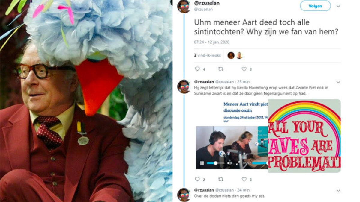 Plaatsten we vanochtend nog een prachtig eerbetoon aan jeugdheld Aart Staartjes, dankzij Skoft 'Hoi' werden we even gewezen op mevrouw Arzu Aslan. Zij is namelijk dolblij met het overlijden van Meneer Aart, want hij was natuurlijk óverduidelijk racistisch. Hij begeleidde vroegâh namelijk de Sint-intochten en vond de hele Zwartepietdiscussie maar een beetje overdreven. Dan ben je natuurlijk een vieze stinkende racistische witte man en dan is het maar goed dat je dood bent, blijkbaar.