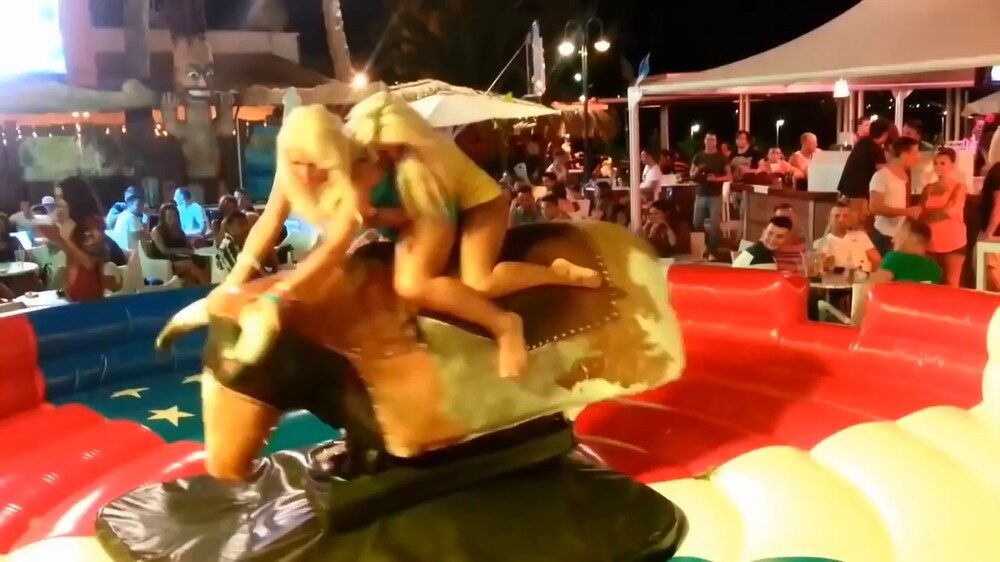 Ritje op een mechanische stier trekt veel bekijks dankzij 2 blondines met een (te) kort rokje
